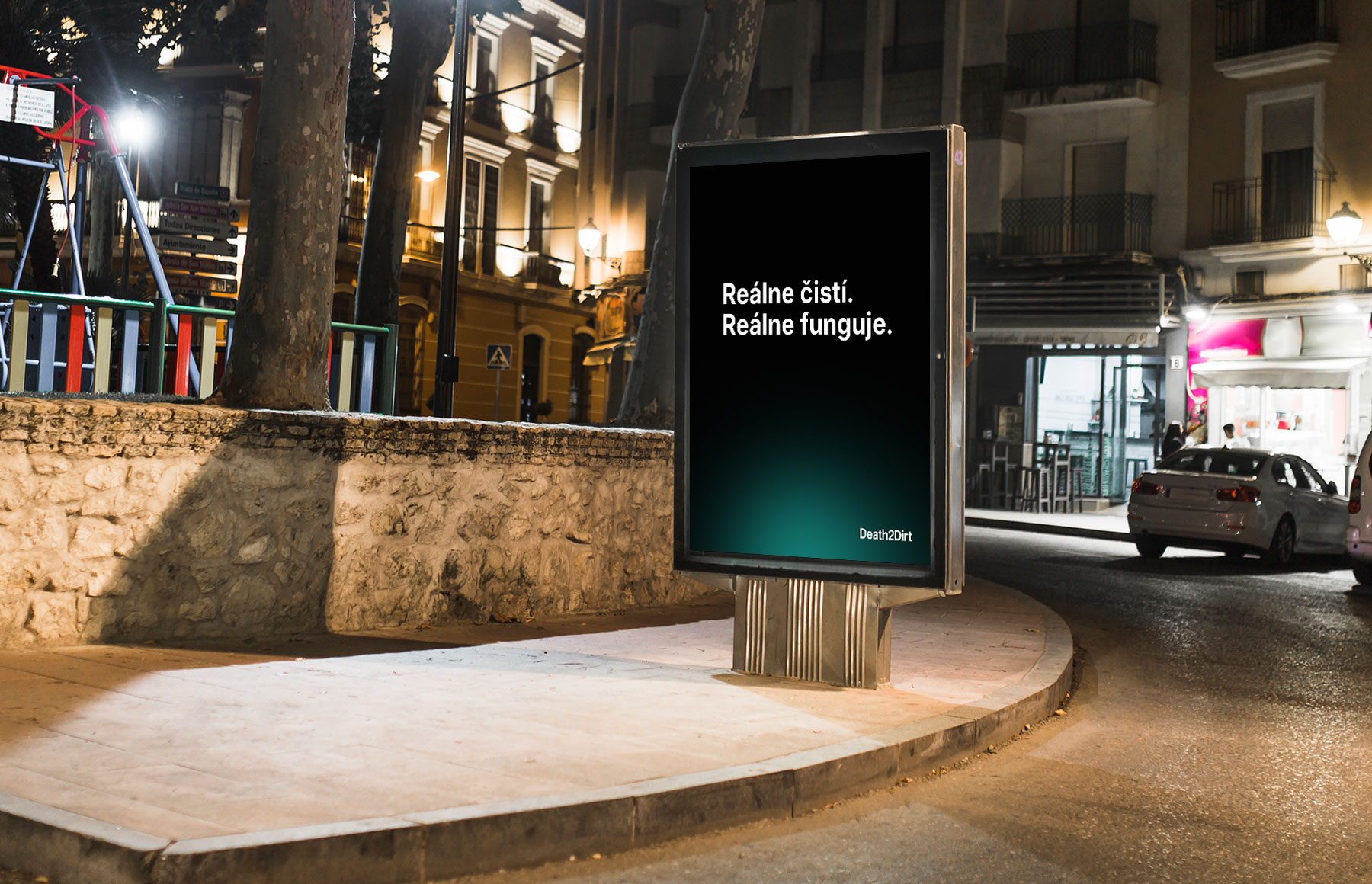 For the bold eco-brand Death2Dirt, I was involved in the creation of the visual and text system. A brand of cleaners that only takes nature seriously and everything else with a dose of irony, contrast and visual boldness. The project included: creating a logo system, splash visuals, 3D bottles in space, as well as a text and editorial system for each of the products: the Dirt Slayer, Kitchen Killer, Bath Basher and Floor Reaper.